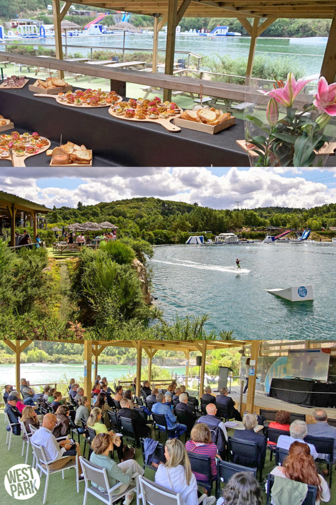 Niché au cœur d’une ancienne carrière, le West Park propose un cadre atypique, propice à la détente et à la cohésion d’équipe. Notre offre initiale de téléski nautique, activité unique en son genre, s’est enrichie pour proposer désormais 5 autres activités variées, telles que l’aquapark avec son parcours de jeux sur l’eau, les bateaux électriques sans permis, le paddle, le canoë-kayak, et le laser game. En parallèle, le West Park propose également son espace bar-restauration – avec sa carte sucrée salée – pour accueillir particuliers et groupes. Enfin, nous pouvons mettre à disposition « La Cabane » : un bel espace semi-couvert avec estrade, écran 85 pouces (2,10m), auditoire de 70 places assises, idéal si vous avez besoin d’un temps de réunion / présentation informel et convivial, dans un cadre atypique. A bientôt au West Park !